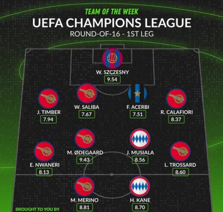 Whoscored评本轮欧冠最佳阵:厄德高领衔阿森纳7人入选,凯恩在列